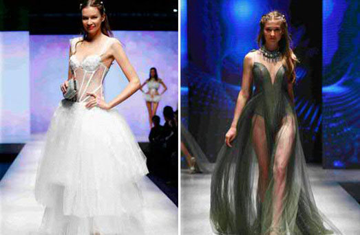 海之秘境,犹如一幅深邃的画面,神秘而又浓烈。本系列的色调运用成熟且大胆,展现出设计师们的多变风格。随着水纹蓄势待发汇聚成海,厚重的水纹线条肆意延伸,浓烈色调让人感受到大海的力量。深蓝色亮片系列运用半透明的面料,神秘感十足,在层叠组合间丰富地点缀着高级亮片及水钻配饰,精雕细琢的高超手工艺更打造出梦幻浪漫的气息,飘渺的海生植物,灵异的奇花异卉,深海的水生藤蔓,秘境中奇妙的自然元素在设计师手中也变的更为有趣和出彩。在模特身上,我们看到了充满原始感的植物线条,似真似假地随波荡漾,光与影的交错重叠,浓与淡的色彩游戏,深浅相宜的传递出海之秘境的浓重与内涵,奢华的金丝在飘逸轻薄的面料上交织出精致的纹路或立体的图案,幻影迷离中展现着这一系列的魅惑性感,却又与高贵端庄兼得,让人美不胜收。