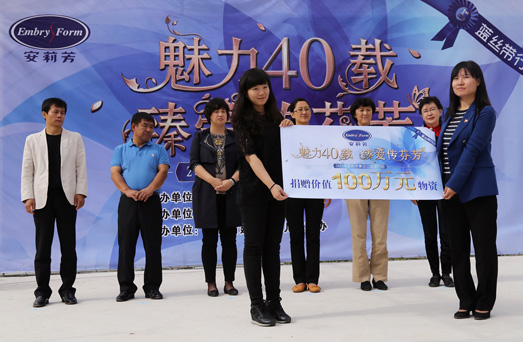 2015年是安莉芳集团成立40周年,也是蓝丝带慈善公益活动的第九个年头,作为一个有社会责任感的爱心企业,安莉芳不忘回馈社会,始终坚持慈善事业。在安莉芳常州新厂落成之际,安莉芳集团向中国妇女发展基金会捐赠价值520余万元的物资,也代表着2015“魅力40载·臻爱传芬芳”蓝丝带公益慈善活动正式启动,中国妇女发展基金会理事长黄晴宜向安莉芳颁发捐赠证书,并对安莉芳集团九年来的无私奉献给与了高度评价。“安莉芳集团就是这样一个有着大爱的企业。她是中国妇女发展基金会的老朋友,也是共同开展公益活动的好伙伴!公益项目的顺利实现离不开她的爱心支持!”